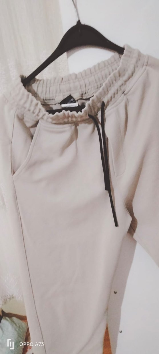 Yumuşak sentetik kumaştan yapılmış, elastik bel ve bağcıklı bej mini rahat kesim eşofman. Günlük rahat sokak stili için ideal, konforlu ve şık. ️Kalıbı küçüktür s giyen kişilere de olur
