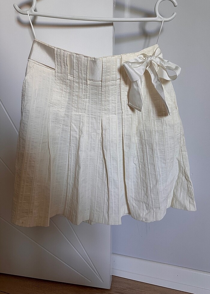 Ekru renk, diz üstünde biten fiyonk detaylı kalın pileli etek.