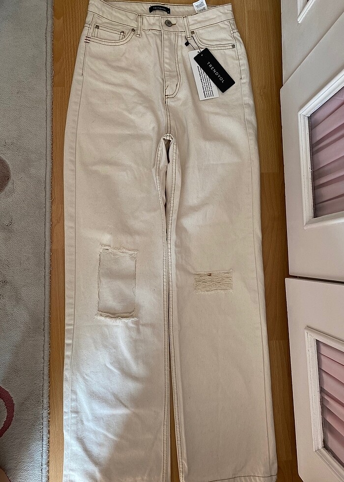 Trendyol markalı etiketi üzerindedir. 36 beden jean pantolon paçası bol boru paça tarzında fotolardan bakabilirsiniz