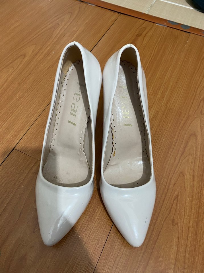Ekru-pudra renkte, lastik malzemeden yapılmış,minimalist ve klasik tarzda stiletto topuklu kadın ayakkabısı, ofis kullanımı için uygundur.