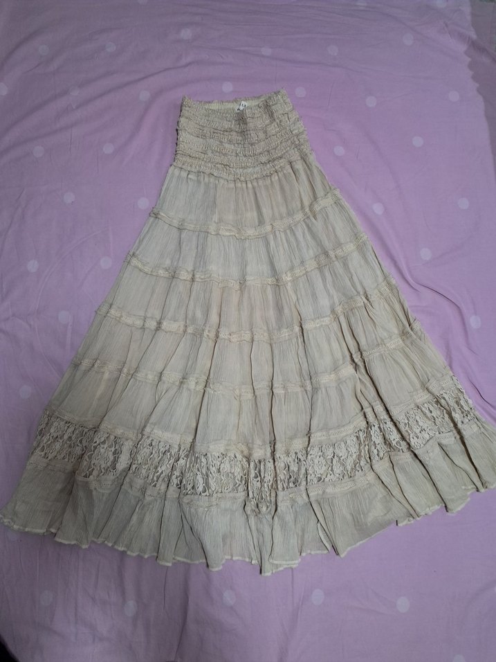 Ekru renkte, keten kumaştan uzun, bol kesim ve fırfırlı detaylara sahip bohem tarzda bir etek. beli gipeli standart beden 3.790tlye almıştım etiket fiyatı üzerinde duruyor