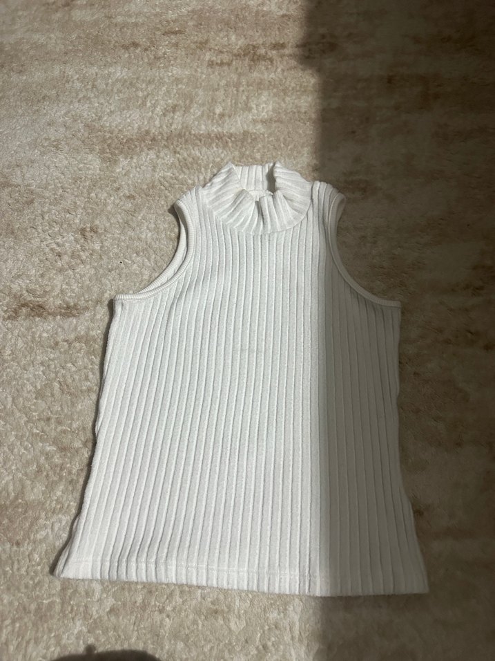 Kırık beyaz kaşkorse kumaştan 36 beden yarım balıkçı kolsuz bluz, bel hizasında boyu vardır, hiç sorunu yok.