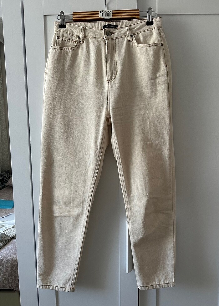 Ekru Yüksek Bel Mom Jean
