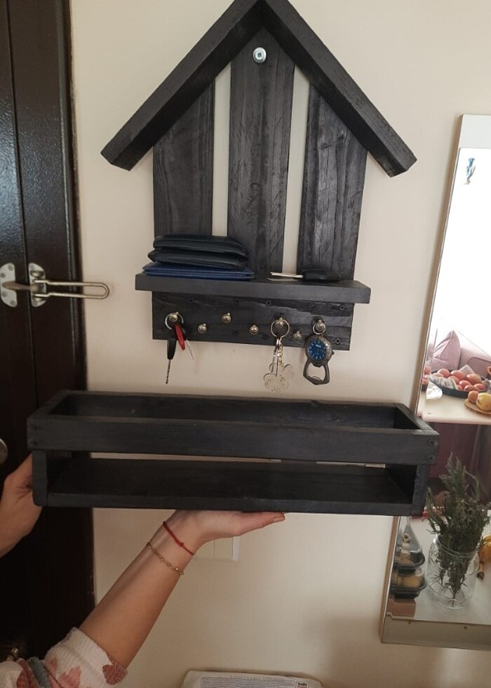 El ayapımı özel tasarım raf ve anahtarlık,ikili takım ,asıl renk acı kahve ama fotoğrafta siyaha yakın çıkmıştır,isteğe göre ayrı olarak da satış yapılır