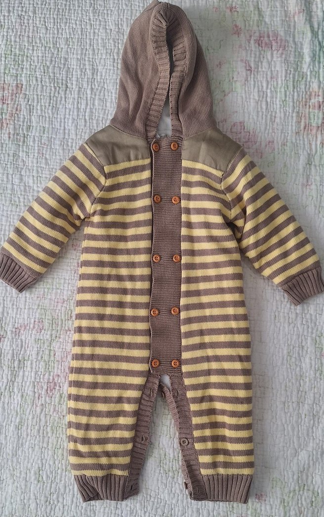 Kapüşonlu, düğmeli, kahverengi ve gri tonlarda örgü bebek tulumu, sıcak tutar ve rahattır. ici polarlidir 18-24 ay hiç kullanılmamıştır