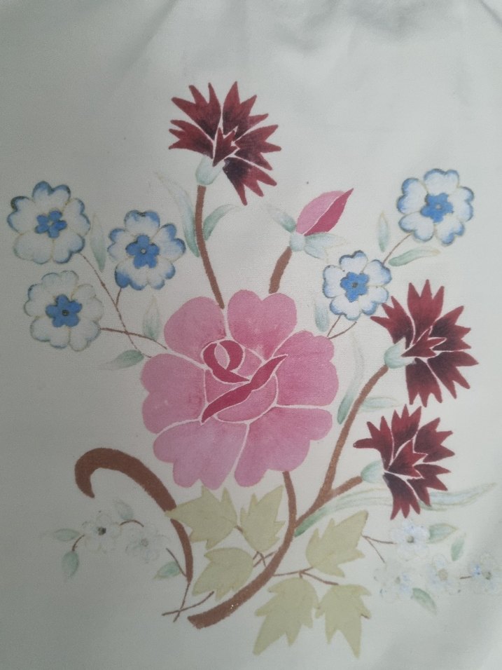 İki adet beyaz kırlent kılıfı, pastel renklerde geleneksel el boyama çiçek desenleriyle süslenmiştir. Yumuşak dekoratif bir dokunuş katar.