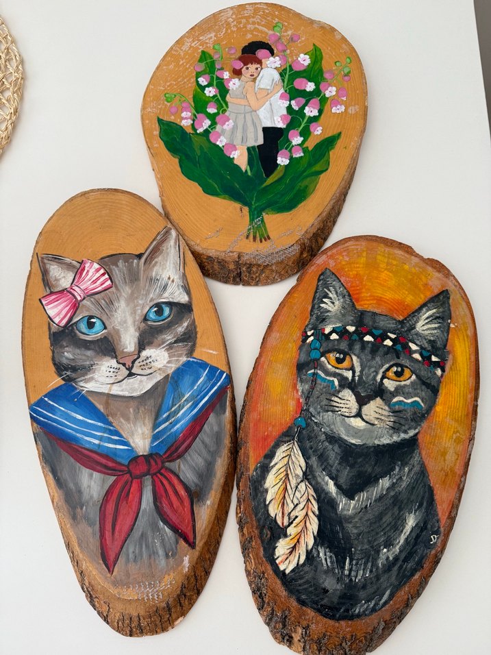 El boyaması kedi portreleri ve çiçek desenleri içeren doğal ahşap dilimler, kedi severler için uygun. Kahve sunum tepsisidir tamamen el emeğidir tane fiyatıdır almak istediğiniz ürünü ilan açtırınız