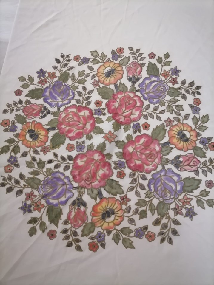 Hafif renk tonlarında, çok renkli çiçek desenli ve klasik tarzda masa örtüsü. En az 30 yıllık