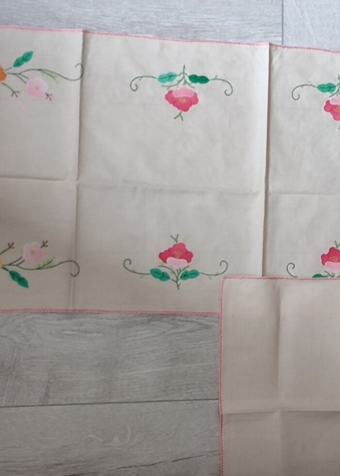 Hiç kullanılmadı. Biri sandıkta kalmasından dolayı ufak bir leke olmuş. 8 parça dikdörtgen peçete, 8 parça kare peçete ve 1 parça şimentabla bulunmaktadır.