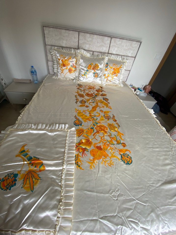 El boyaması canlı çiçek desenli beyaz yatak örtüsü seti, fırfırlı kenarlarla birlikte. yastık kılıfları dahil. Saten kumaş