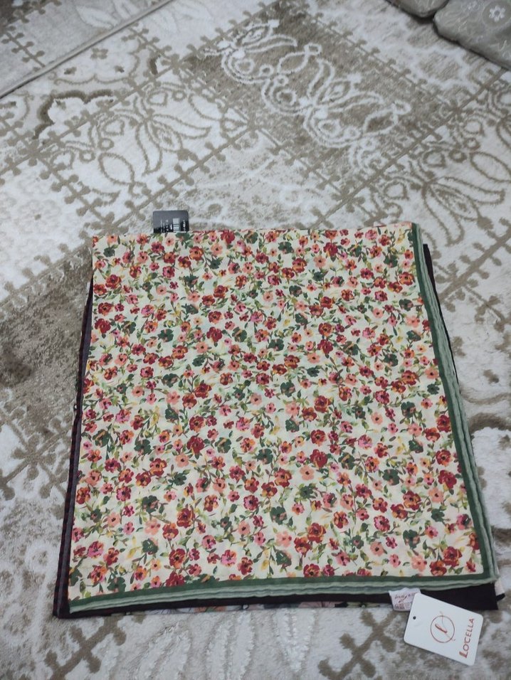 Yumuşak sentetik kumaştan, dantel detaylı, hafif çok renkli çiçek desenli bohem tarzda kadın eşarbıdır.