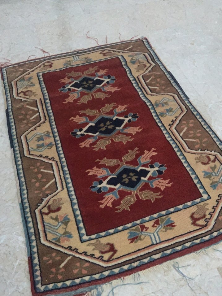 Bordo renkli, nakış desenlere sahip klasik tarzda halı. Bej, mavi ve kahverengi tonlarında merkezi motif ve süslü kenarlığı bulunur. 107-80 cm ölçülerinde