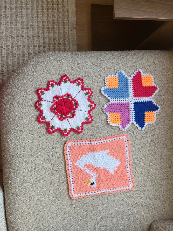 Tamamı elde örülmüş, hiç kullanılmamış 3 parça renkleri canlı çeyizlik lif seti. 1 adet kuş desenli dikdörtgen lif 1 adet çiçek desenli yuvarlak lif 1 adet renkli yıldız model lif %100 el emeği Yumuşak ipten örülmüştür. Çeyizlik olarak hazırlandı, dolapta saklandı Renkleri canlı, işçilikleri temizdir. Hem çeyiz için hem de günlük kullanım için uygundur. #lif #örgülif #çeyizliklif #elörgüsü #çeyizhazırlığı #banyoaksesuarı #elemeği #çeyiz