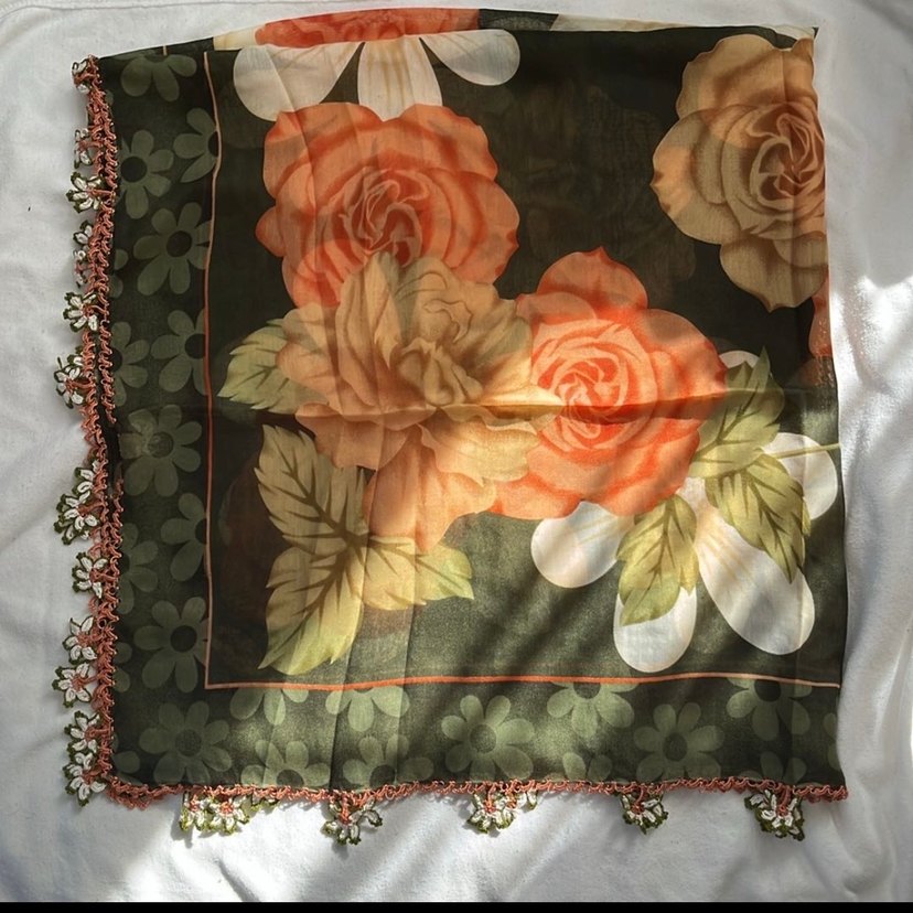 El emeği Kadınlar için çok renkli, koyu tonlarda çiçek desenli, dantel kenarlı eşarp