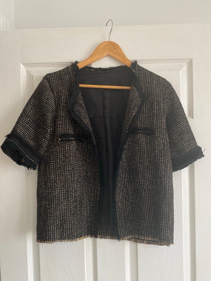 Tamamen el işçiliği ile dikilmiş, özel tasarım tüvit ceket. Modern kısa kol kesimi ve ham bitişli püskül detaylarıyla mağaza ürünlerinden ayrılır. • Tip: Kısa kollu, önü açık (düğmesiz) blazer/ceket formunda. • Doku: İnce altın pırıltılı siyah dokuma tüvit; iç kısmı komple astarlıdır. • Beden: Medium/Large uyumlu (Relaxed fit/Rahat kesim). • Kullanım: Bahar ve yaz akşamları için hafif ve şık bir tamamlayıcıdır.