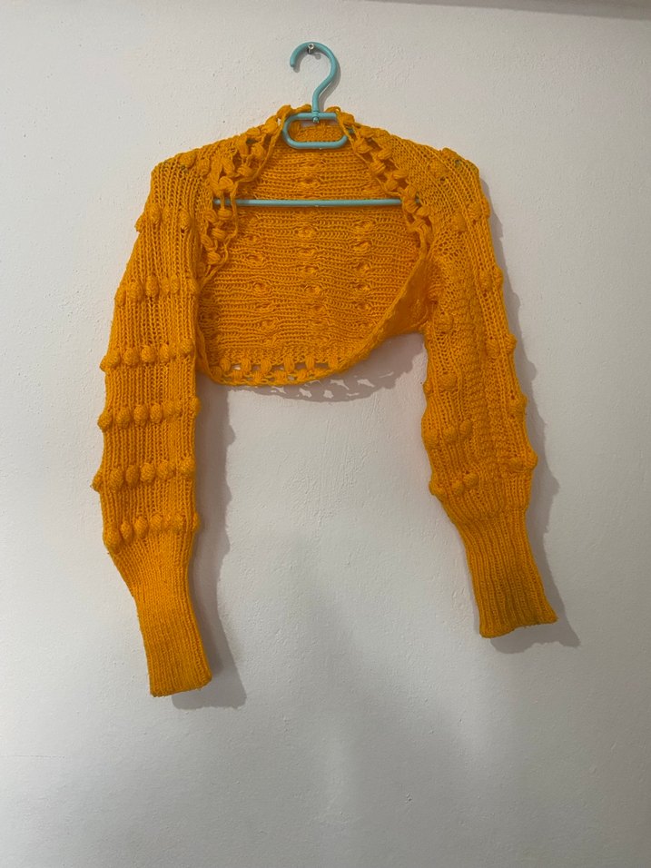El Emeği Ponpon (nohut modeli) Detaylı Çok farklı ve tarz bir parça arayanlar için annemin el emeği bolero! ☀️ Hardal sarısı rengi ve kollarındaki ponpon detaylarıyla çok enerjik bir modeldir. Elbiselerin veya bodylerin üzerine harika bir tamamlayıcı olur. S / M beden için uygundur, sıfır ayarındadır.
