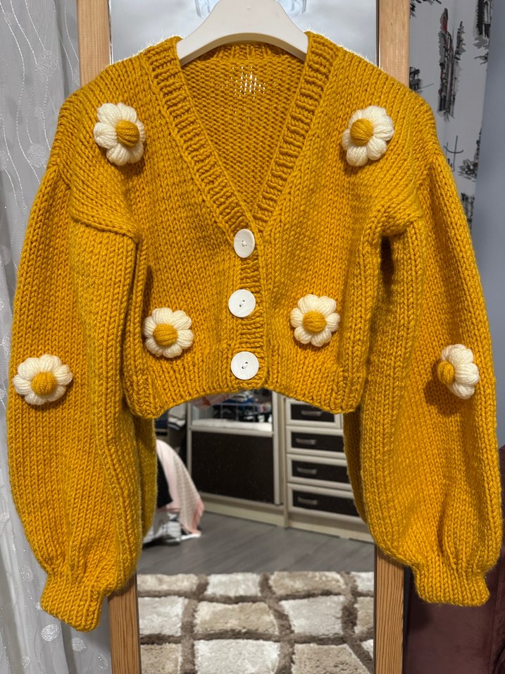 Sarı triko hırka, uzun kollu ve nakışlı çiçek detaylı, bol kesim ve düğmeli, rahat bohem tarzda. Ben 1.65 50 kiloyum.