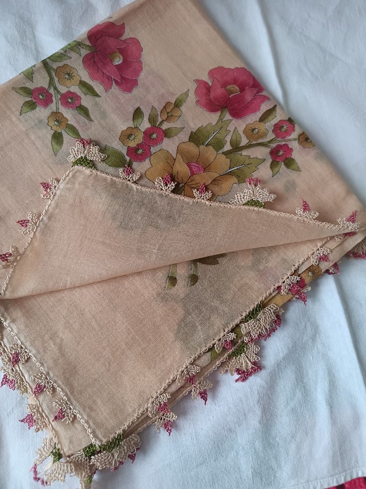Bu bej şal, pastel çiçek desenleri ve ince dantel kenarlarıyla bohem ve retro tarzını yansıtıyor. Yumuşak tekstil malzemeden üretilmiştir. hiç kullanilmadi