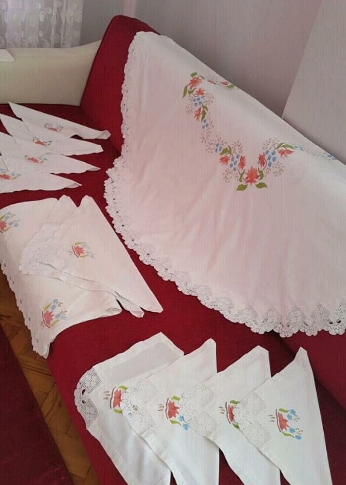 El boyaması ve coton ip ile hazırlanmış Alpaka mutfak takımı...Kısa bir dönem kullanıldı. Tüm detaylar fotoğrafta mevcuttur. Sadece buzdolabı örtüsünün üstüne gelen kısmında sararma var. DANTELI İÇİN BILE ALINIR...SADECE MASA ÖRTÜSÜNE 5 MT DANTEL VAR