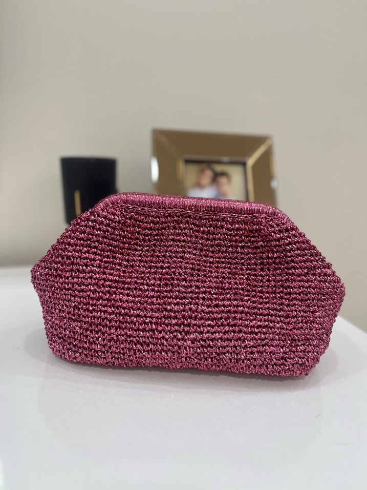 Pembe renkli, metalik büküm ip ile örüldü orta boy iç kısmı astarlıdır.