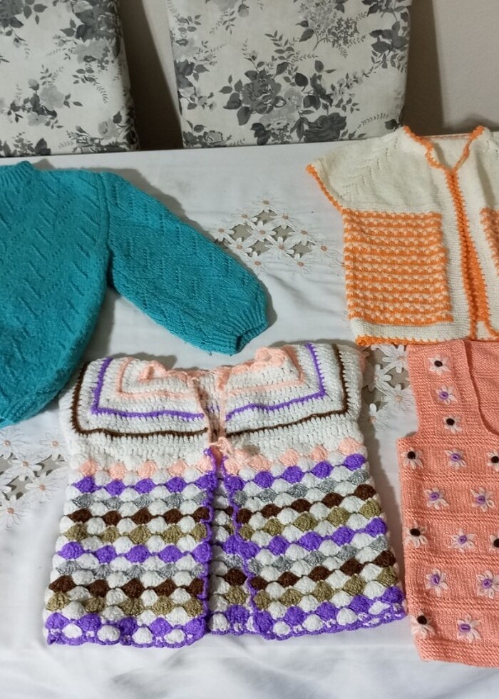 El emeği örgü ceket ,yelek isterseniz daha detaylı fotoğraf atabilirim hiçbir sorunları yoktur mavi ceket 3, 4 yaşa uygun. diğerleri 2 yaşa uygun bilginize