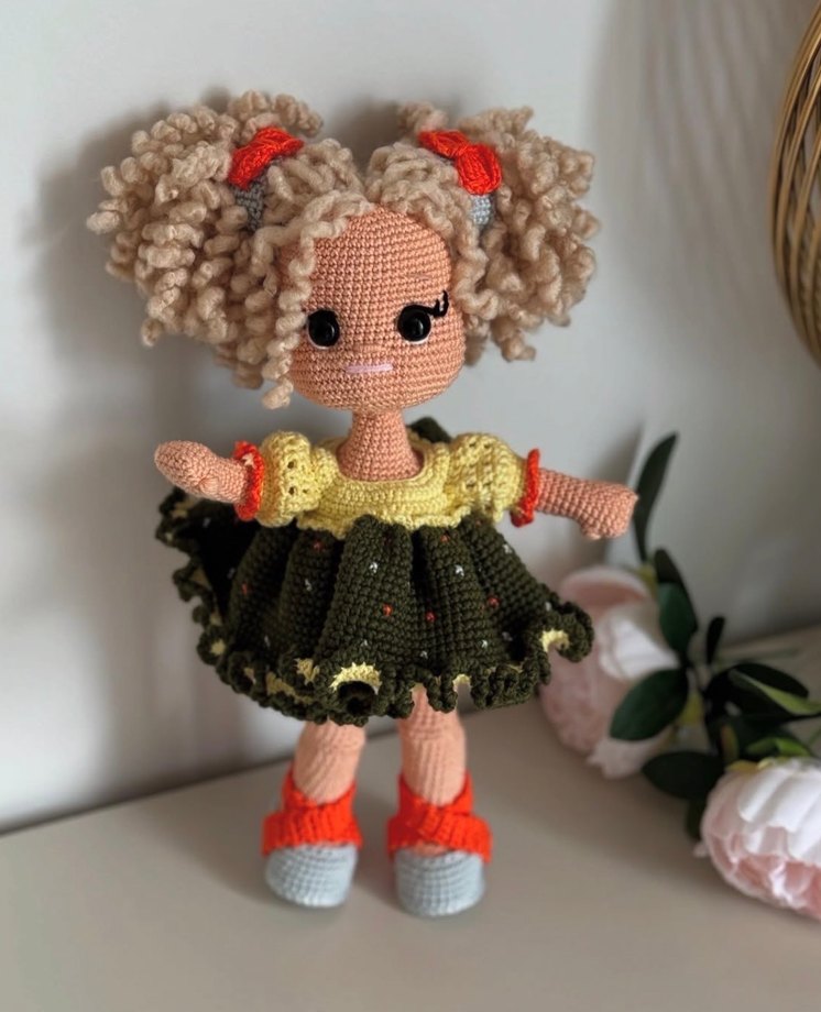 Fiyat bilgisi yazdığınız zaman istediğiniz modele göre verilir ilandaki fiyat gerçek değildir İstenilen siparişi alıyoruz toka,çanta,yelek,ev babeti Kıvırcık saçlı, kırmızı kurdeleli renkli el örgüsü bebek. Sarı üst ve koyu yeşil etek giymekte, kırmızı ayakkabıları var.