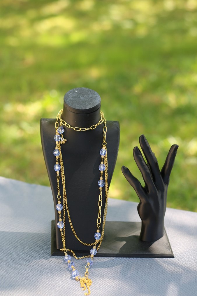 Uzun sarı zincir detaylı, açık mavi boncuklu bohem kadın kolyesi. Günlük kullanıma uygun.