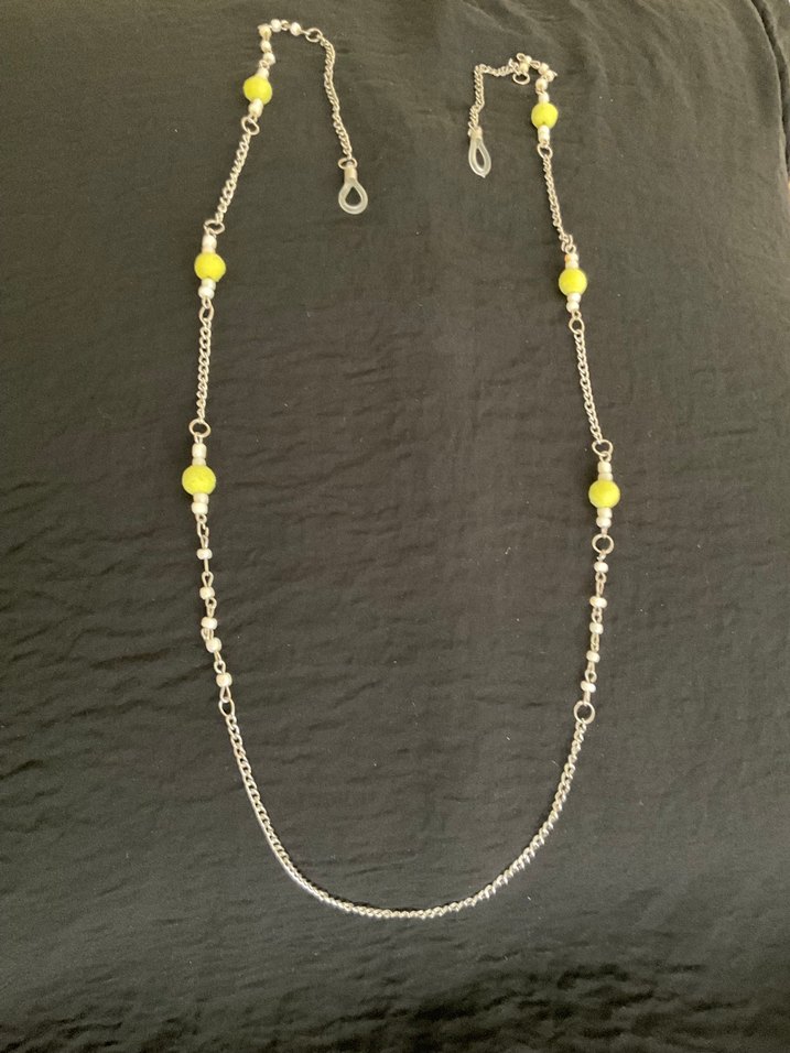 Uzun zincir üzerine sarı boncuklar yerleştirilmiş, günlük kullanıma uygun renkli ve minimalist gözlük zinciri.