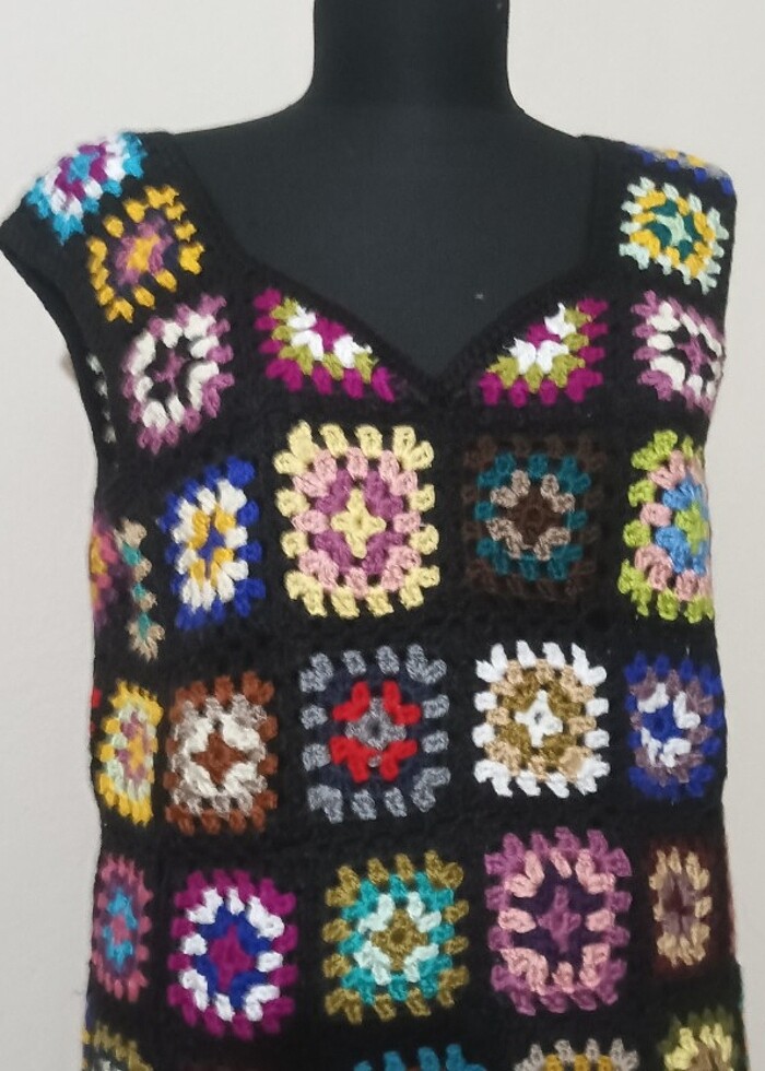 Motiflerden oluşan geniş askılı akrilik ipten örülmüş süveter