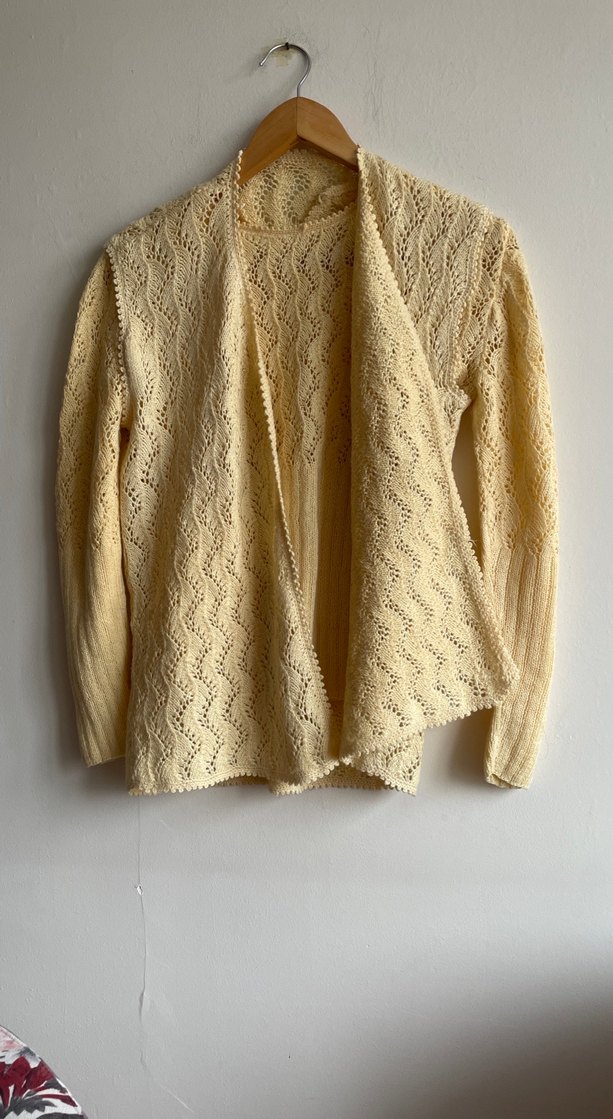 Açık sarı renkli, el emeği bluz ve yelek takımı bir teyzemiz tarafından düzgün olarak çeyiz için örmüş ve hiç kullanılmamış temiz ve kusursuzdur. M bedene uygundur iç bluz iki koltuk altı arası 45 cm esnetmeden ölçtüm boy omuzdan 55 cm yelek iki koltuk altı arası esnetmeden 49 cm boy omuzdan 65 cm değerlendirmek isteyenler için satıştadır