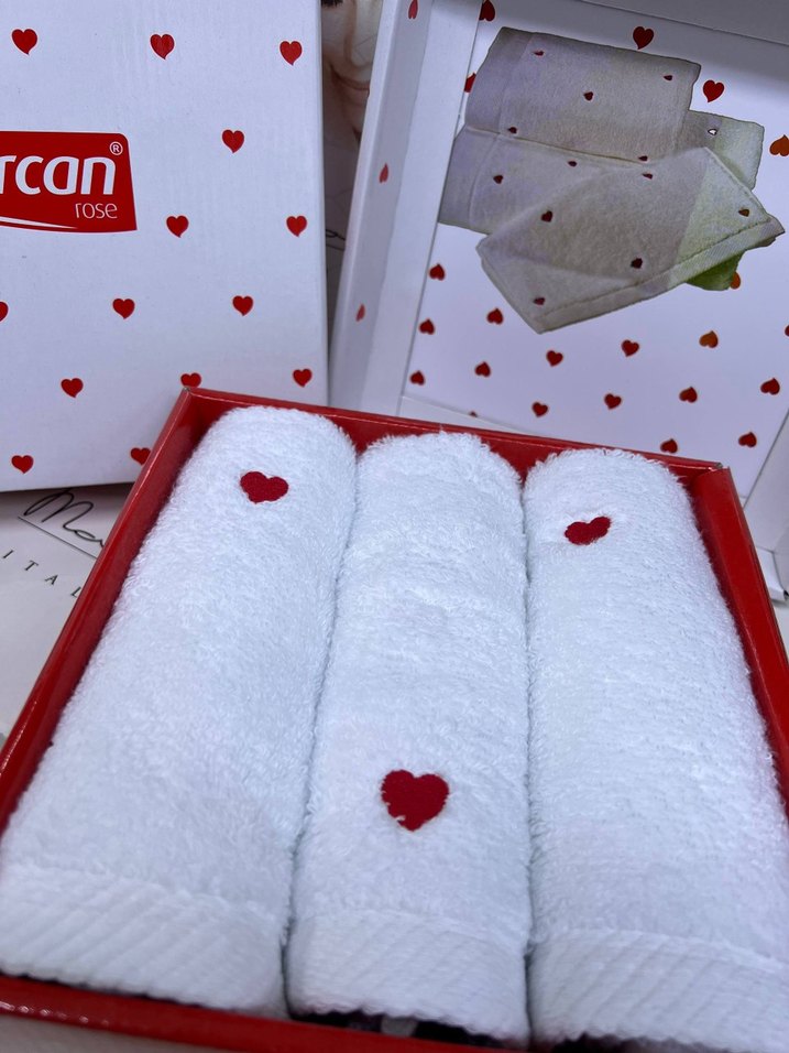 Nakışlı kırmızı kalplerle süslenmiş beyaz havlular, yumuşak ve klasik tarzda. Renkli kalp desenli kutuda paketlenmiştir. 30/50