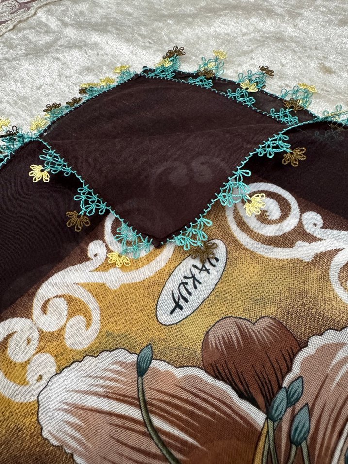 Kahverengi tekstil kumaştan, dantel kenarlı, çiçek desenli bohem tarzda kadın fular.