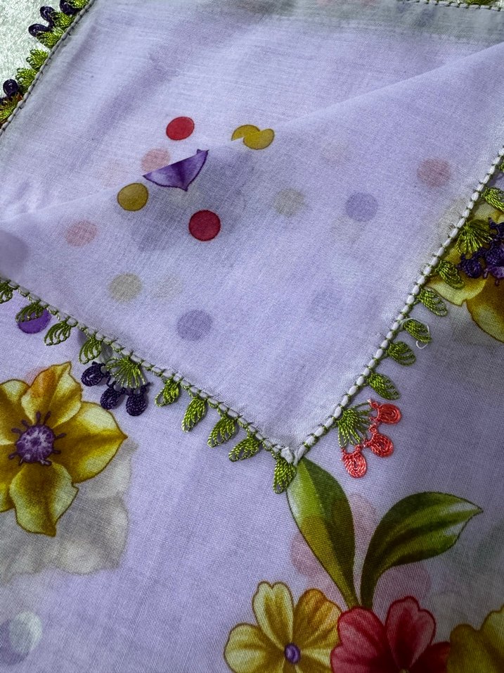 Pastel çok renkli çiçek desenli, dantel detaylı, yumuşak dokulu bohem tarzda kadın fularıdır. Retro ve hippie havası taşır.