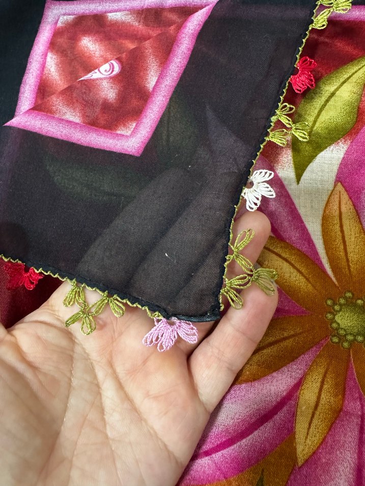 Renkli ve dantel detaylı, yumuşak sentetik kumaştan yapılmış bohem kadın fularıdır.