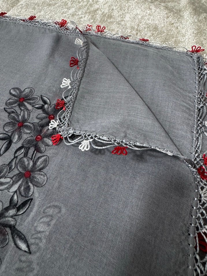 Gri renkte, dantel kenarlı ve çiçek işlemeli kadın fular. Bohem tarzına uygun, yumuşak dokulu ve klasik tasarımlı, kırmızı ve beyaz dantel detaylı.