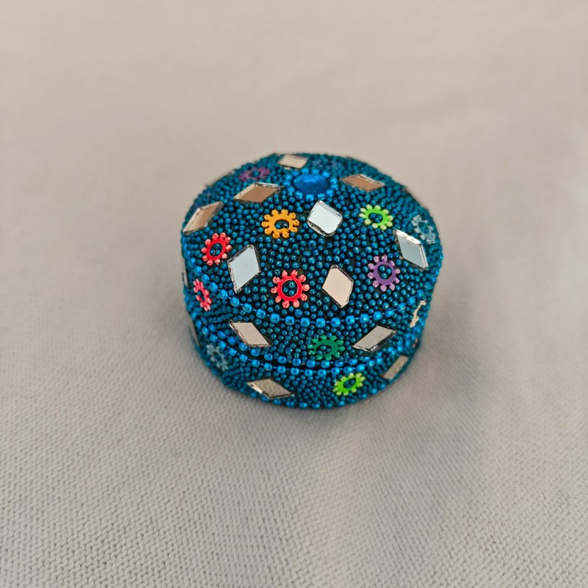 Bu renkli, el yapımı mücevher kutusu, canlı boncuklar ve ayna detaylarıyla işlenmiş, bohem tarzını yansıtan bir aksesuardır. Biblo olarak ta kullanılır. Ölçü resimde verildi defosuz. Fiyat son.