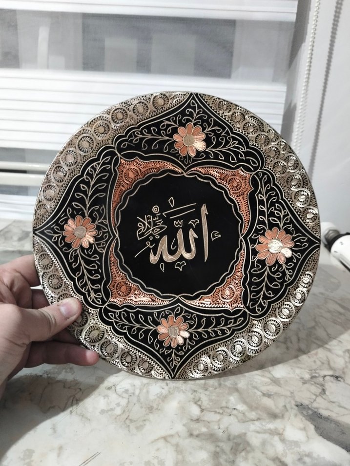 Ortada 'Allah' yazısı bulunan, çiçek ve geometrik desenlerle süslenmiş el işçiliği dekoratif tabak.
