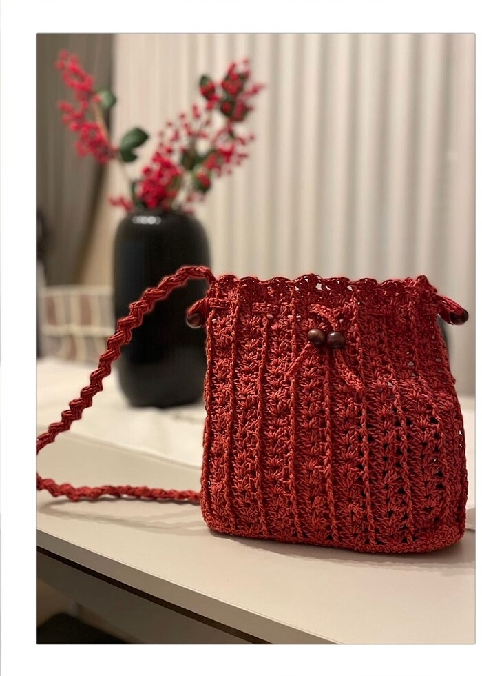 Tamamen el işçiliği sıfır vişne rengi örgü çanta