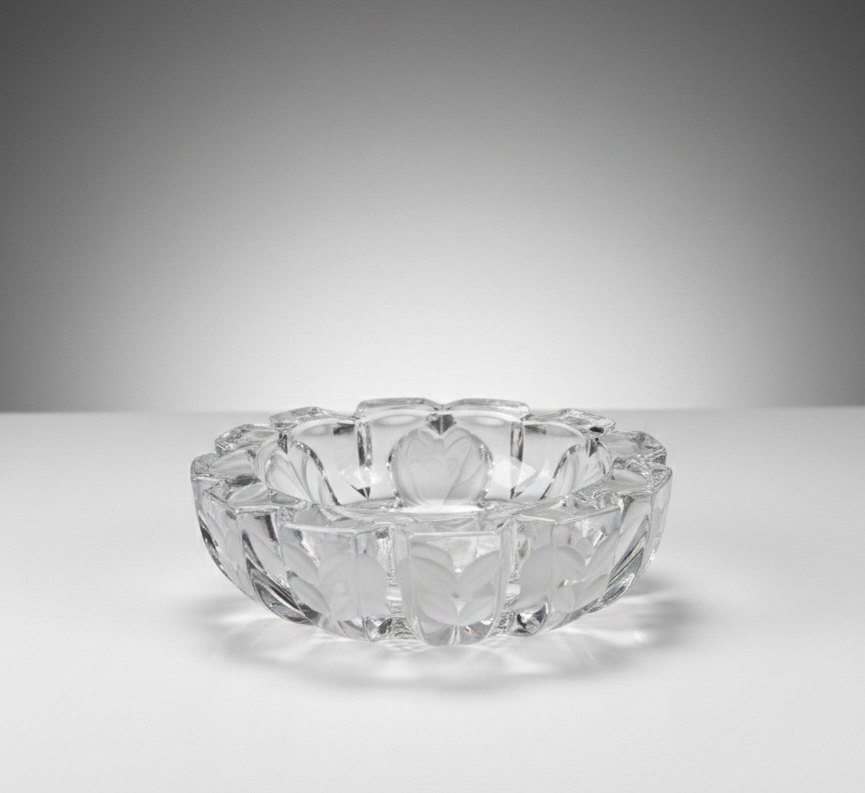1950'li yılların zarafetini ve ağır kristal işçiliğini yansıtan bu nadide parça, hem koleksiyonluk bir obje hem de şık bir dekoratif unsurdur. Orta kısmındaki büyük gül kabartması ve kenarlarındaki buzlu cam (frosted) detaylarıyla döneminin en zarif örneklerinden biridir. Ürün Özellikleri: • Dönem: 1950'ler (Mid-Century Vintage). • İşçilik: Küllüğün tabanında ve yan panellerinde el işçiliğiyle yapılmış, derinlikli gül motifleri bulunmaktadır. • Malzeme: Yüksek kaliteli, ışığı mükemmel kıran ağır Avrupa kristali. • Tasarım: Kenarları geometrik kesimlerle zenginleştirilmiş, orta kısmı ise sanatsal bir gül kabartmasıyla taçlandırılmıştır. • Durum: Koleksiyonluk kondisyondadır; çatlak, kırık veya kullanım izi yoktur.