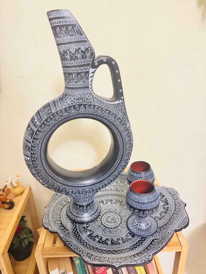 El yapımı seramik set, geleneksel siyah-beyaz desenlerle süslenmiş sürahi, iki kadeh ve dekoratif tepsiden oluşur. SERAMİK HALKALI GÜNEŞ HİTİT TESTİ TEPSİ VE KADEHLER TESTİSE Bİ ATIK VAR #antika #antik