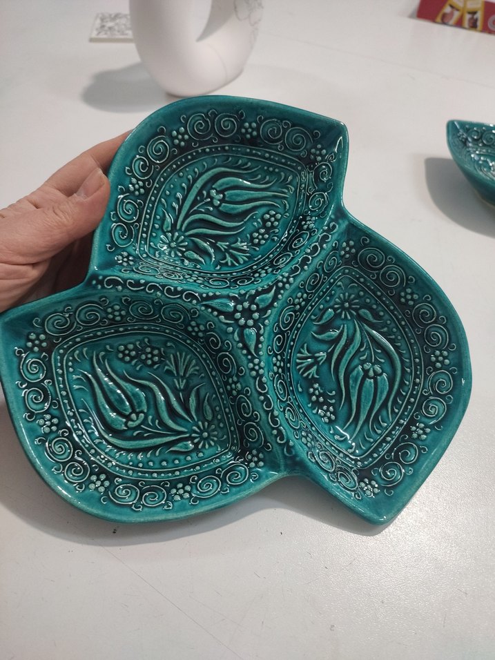 El işçiliğiyle yapılmış, turkuaz renkte, üç bölmeli ve detaylı çiçek desenli seramik tabak. Hem dekoratif hem kullanışlıdır.