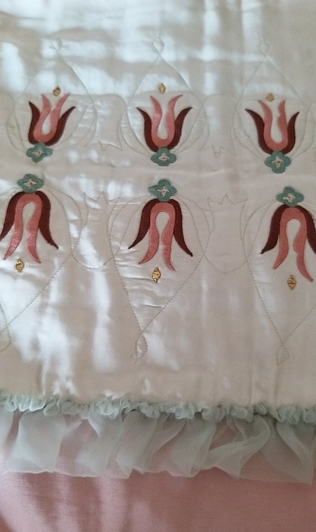 Nakışlı desenlere sahip, pastel yeşil saten kumaştan kenarı ince fırfırlı kenarıolan el emeği şase