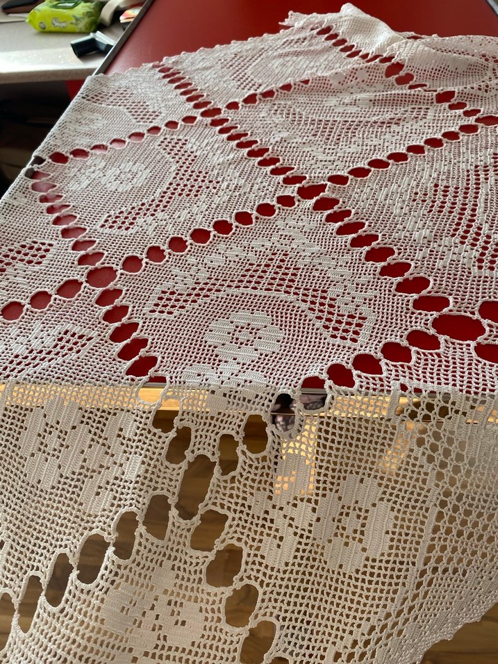 İnce iplikten el işi beyaz dantel masa örtüsü, geleneksel çiçek desenleriyle süslenmiştir.