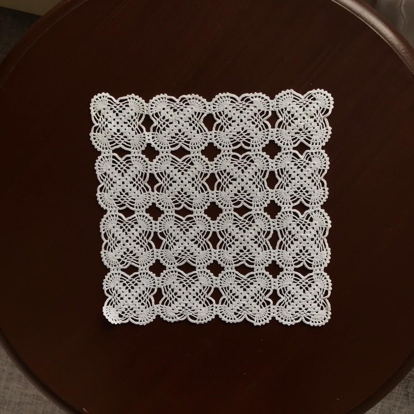 Bu beyaz dantel örtü, ince el işi düğüm desenleriyle klasik kare tasarıma sahiptir. Herhangi bir yüzeye geleneksel bir dokunuş katar. 3 adettir.