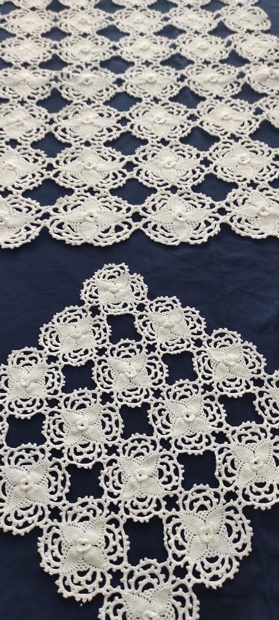 El işi beyaz dantel örtü, detaylı çiçek desenleri ve zarif boncuk süslemeleriyle dekoratif kullanım için uygundur.