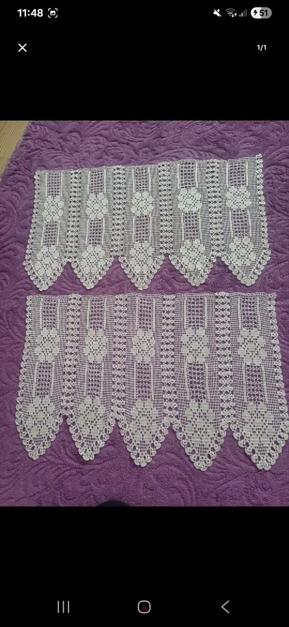 İnce çiçek desenli beyaz el işi dantel perde kenarları, sivri uçlu ve zarif bir görünüme sahip. Tanesi