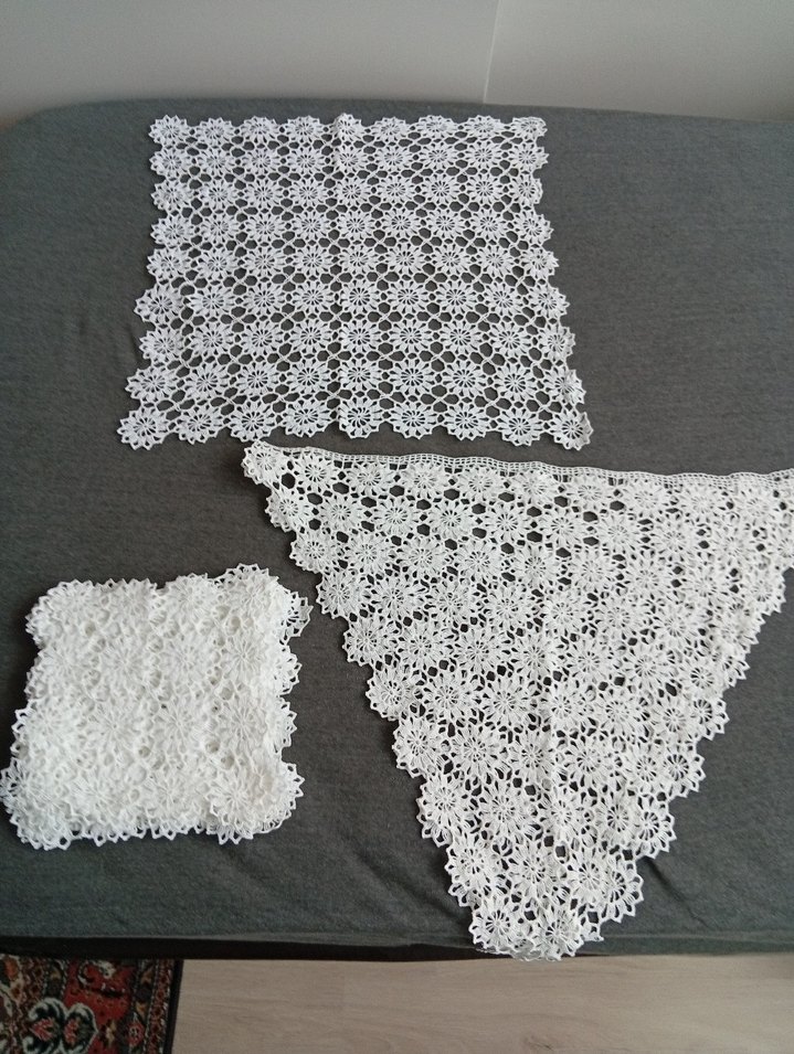 Çiçek desenli beyaz el işi dantel takımı, kare ve üçgen parçalar içerir. Dekoratif kullanım için uygundur. 12 parça 19 x 19 cm .1 parça 45 x 45 cm ..2 parça üçgen şeklinde 54 x 58 cm.