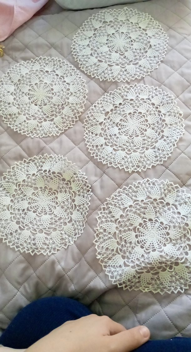 Beyaz, yuvarlak, el işi dantel Amerikan servis seti, detaylı desenleriyle masa dekorasyonu için uygundur. 5 adettir.