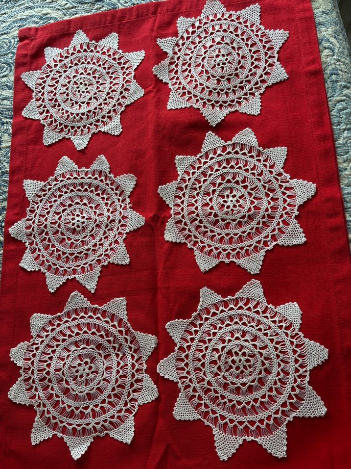 Kırmızı zemin üzerinde el işi beyaz dantel yuvarlak motifler. Her motif yıldız şeklinde kenar detaylarına sahip ince işçilikle örülmüştür.