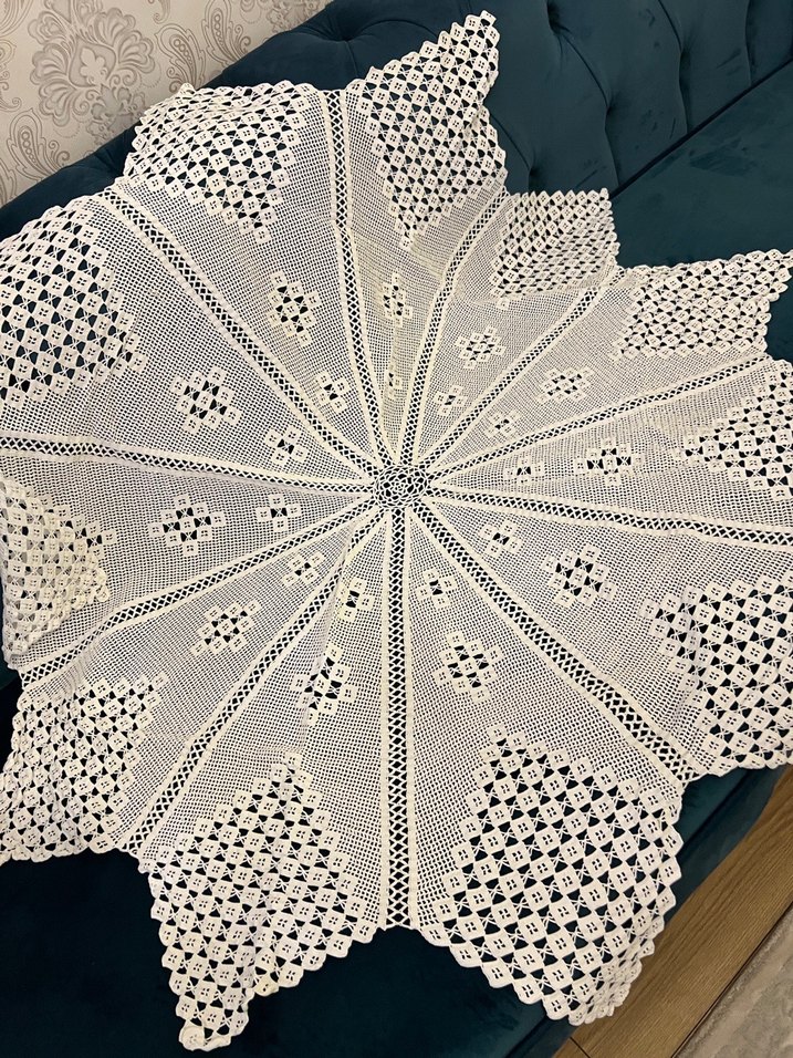 Yıldız şeklinde ve ince motiflere sahip, el işi beyaz dantel masa örtüsü.